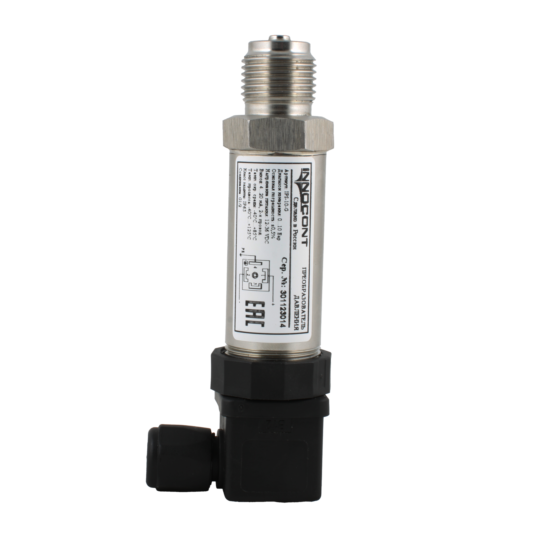 Преобразователь давления, диапазон 0...6 бар, точность 0,5%, -40 +125 С, 12-36 VDC, IP65, разъем DIN 43650 A, выход 4...20 мА 2-пров., соединение- резьба G1/2", нерж. сталь